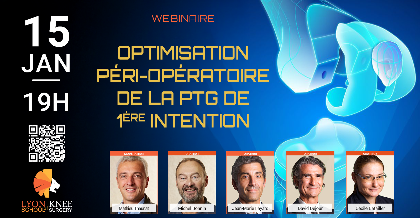 Le prochain congrès des Journées Lyonnaises du Genou aura lieu en septembre 2026 et portera sur la Prothèse Totale du Genou de 1ère intention. Le premier webinaire de ce congrès traitera de l'optimisation péri-opératoire de la PTG de 1ère intention. Nous aborderons le planning préopératoire, la préhabilitation avant une PTG, la gestion per- et post-opératoire avec notamment l'antalgie et la thromboprophylaxie, ainsi que la rééducation et le suivi à réaliser. Il y aura bien entendu un temps de discussion et d'échanges. Nous vous attendons nombreux le 15 Janvier.